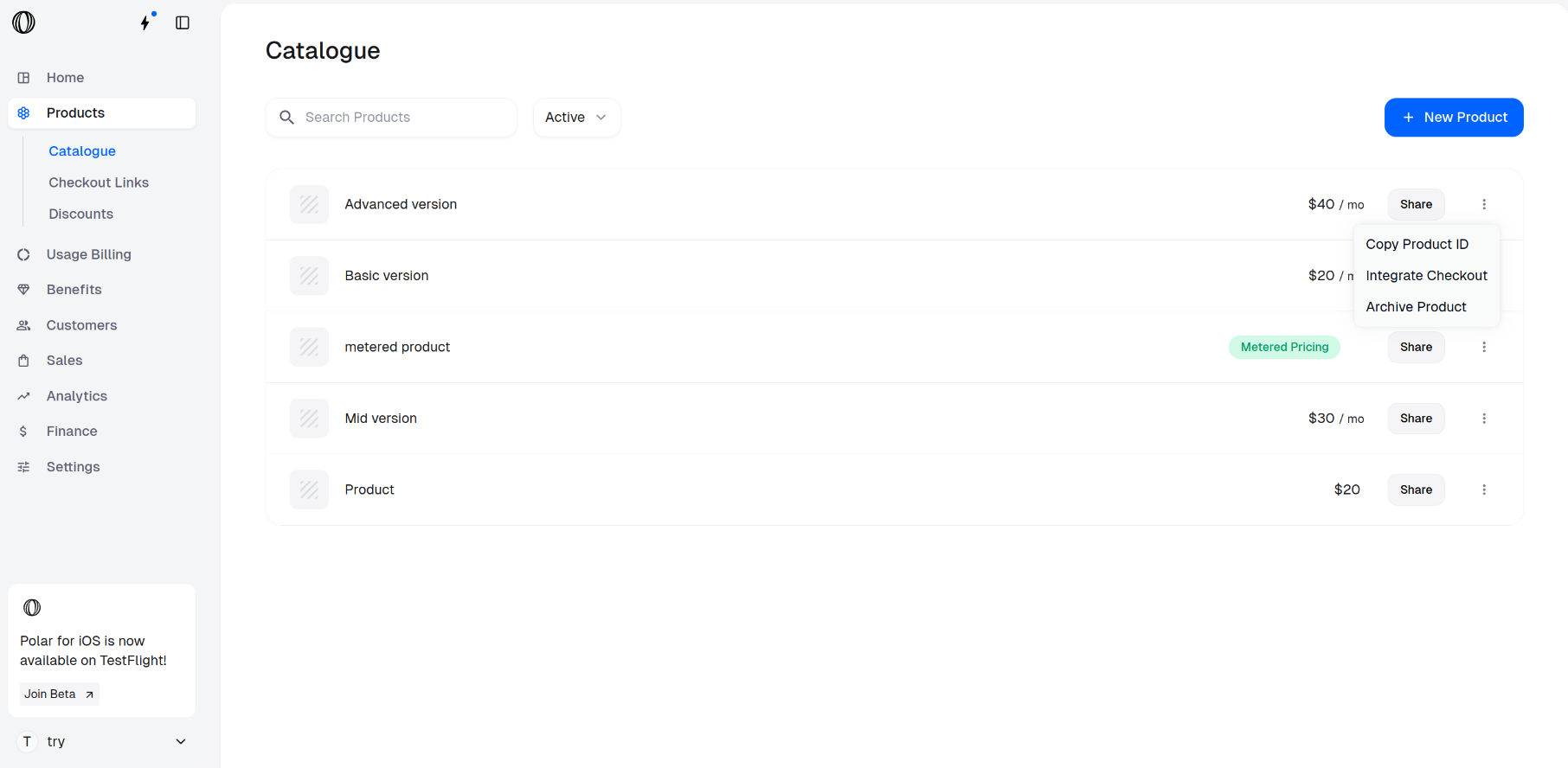 In the Polar dashboard sidebar, navigate to Products > Catalogue for your organization.