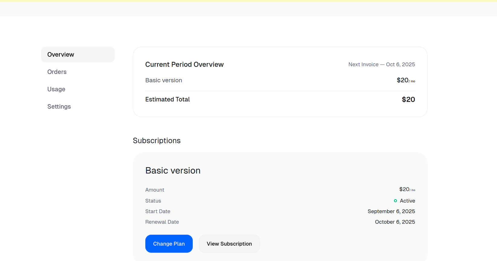 In the Overview tab of Customer Portal, scroll to Subscriptions and click on Change Plan.